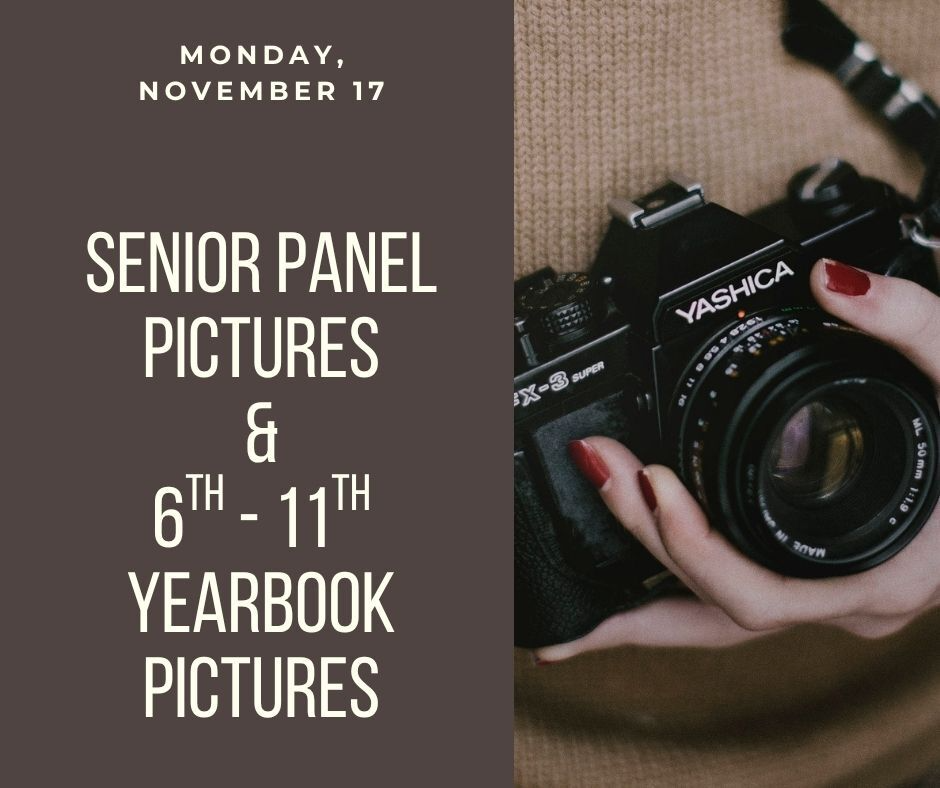 Monday, November 17 - Senior Panel Pictures and 6th-11th grade yearbook pictures. Online students come between 12:00 pm and 1:30 pm. Seniors: The photographers will bring button-up shirts and ties f. . .