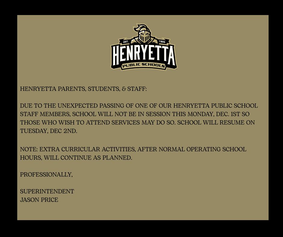 Henryetta Public Schools is focused on providing creative, dynamic, and advanced learning opportunities for all students by establishing a positive learning environment that is continuously adapting and improving. The Henryetta Board of Education is actively increasing the expectations of the district in the belief that all students can continue to learn and grow while achieving above and beyond their current educational capacity with the right to receive the support and dedication to do so. It is understood that a quality educational environment is produced by everyone within the educational process, including the school system, home environment, and community working together for positive outcomes. It is the standard of operation that every student is entitled to respect and dignity as an individual as they are also expected to carry a spirit of teachability and honor to the educational process and those with whom it involves. It is recognized that education is a life-long process that is continually evolving. By collaborating to achieve the ultimate goal of empowering each student, dynamic results will occur, and upon graduation, each student will be prepared with the skill set to be a marketable and productive citizen.